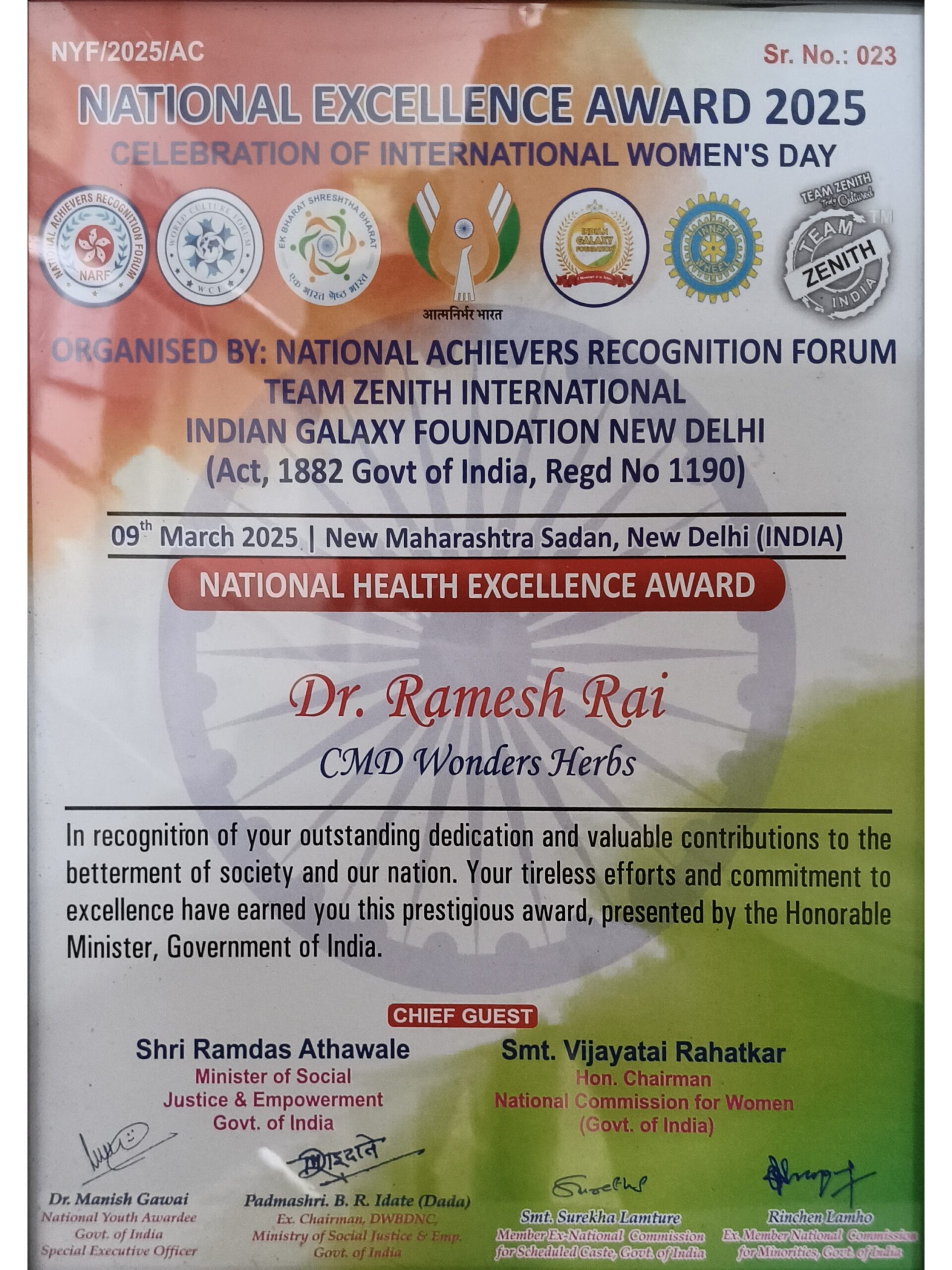 Dr. Rai’s profound expertise in herbal formulations, lifestyle therapies, and global wellness collaborations ensures that every Wonder Herbs product is crafted with authenticity, quality, and the timeless wisdom of Ayurveda.